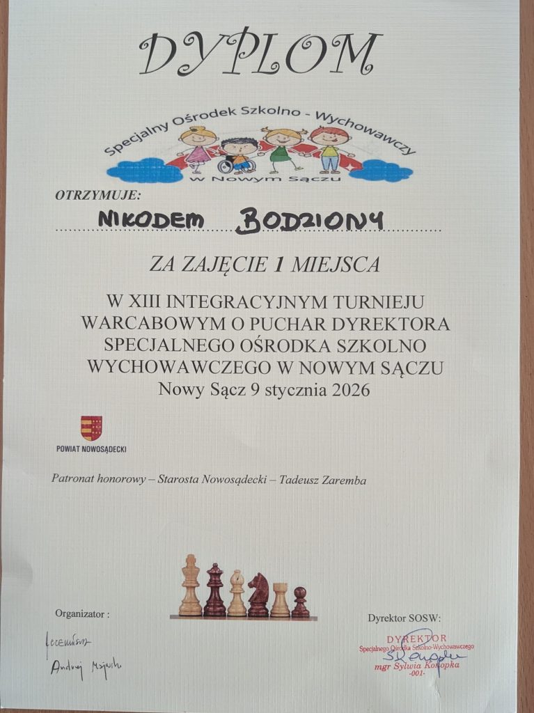 Gratulujemy Nikodemowi Bodzionemu, uczniowi klasy 3D, zajęcia I miejsca w XIII Integracyjnym Turnieju Warcabowym o Puchar Dyrektora Specjalnego Ośrodka Szkolno-Wychowawczego w Nowym Sączu pod patronatem honorowym Starosty Nowosądeckiego.