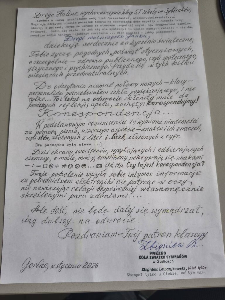 Uczniowie otrzymali od Pana Zbigniewa listy, w których znalazły się słowa wsparcia, motywacji oraz cenne wskazówki na przyszłość. Był to miły i inspirujący gest, który sprawił uczniom wiele radości i pokazał, jak ważna jest relacja oparta na dialogu i życzliwości.